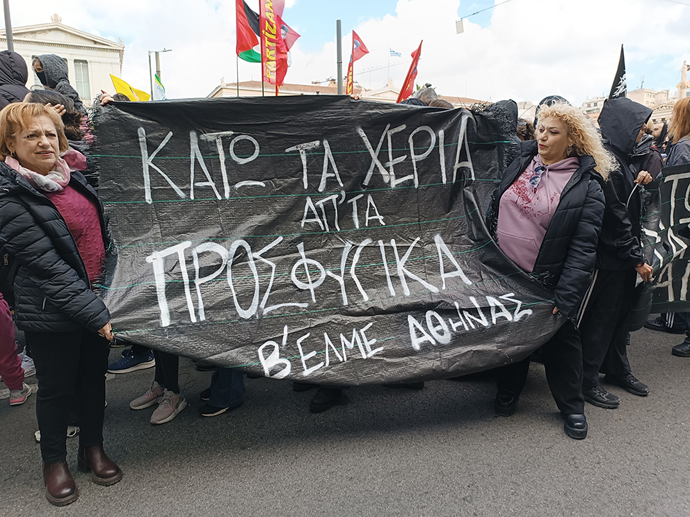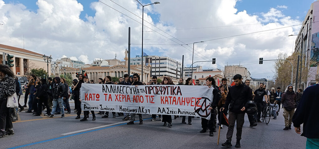 Η πορεία ήταν δυναμική. Συμμετείχαν πάνω από 2000 άτομα. Έφτασε στο Σύνταγμα και επέστρεψε στα Προπύλαια όπου διαλύθηκε. “10, 100, χιλιάδες καταλήψεις ενάντια ς’ ένα κόσμο οργανωμένης σήψης”, “Κοινότητες αγώνα σε κάθε γειτονιά – Κάτω τα Χέρια απ’ τα Προσφυγικά”, “Ή θα νικήσουμε – ή θα νικήσουμε !” ήταν μερικά από τα συνθήματα που ακούστηκαν στην πορεία. Μαζί με την Κοινότητα των Κατειλημμένων Προσφυγικών διαδήλωσε η οικογένεια του 18χρονου Ρομά Νίκου Σαμπάνη που δολοφονήθηκε στο Πέραμα, με πανό είδαμε τους συλλόγους εκπαιδευτικών “Η Αθηνά”, από την Β’ ΕΛΜΕ Αθήνας, Αρχιτέκτονες, η δικηγόρος Αννυ Παπαρρούσου από την επιτροπή υπεράσπισης της κοινότητας των Προσφυγικών, Αγωνιστές εκπαιδευτικοί από περιοχές της Αττικής, μέλη από την “Ανοιχτή Συνέλευση Κατοίκων Πετραλώνων – Θησείου – Κουκακίου”. Με πανό πορεύτηκε η Ανοιχτή Συνέλευση Κατάληψης “ΛΚ37”, το Αναρχικό Στέκι “Αντίπνοια”, συλλογικότητες του Αναρχικού και Αντιεξουσιαστικού χώρου. Με πανό, σημαίες και προκήρυξη με τίτλο “Ο ΑΓΩΝΑΣ ΤΩΝ ΚΑΤΕΙΛΗΜΜΕΝΩΝ ΠΡΟΣΦΥΓΙΚΩΝ ΕΡΧΕΤΑΙ ΑΠΟ ΤΟ ΜΕΛΛΟΝ” έδωσε το “παρών” και το “Εργατικό Επαναστατικό Κόμμα”.