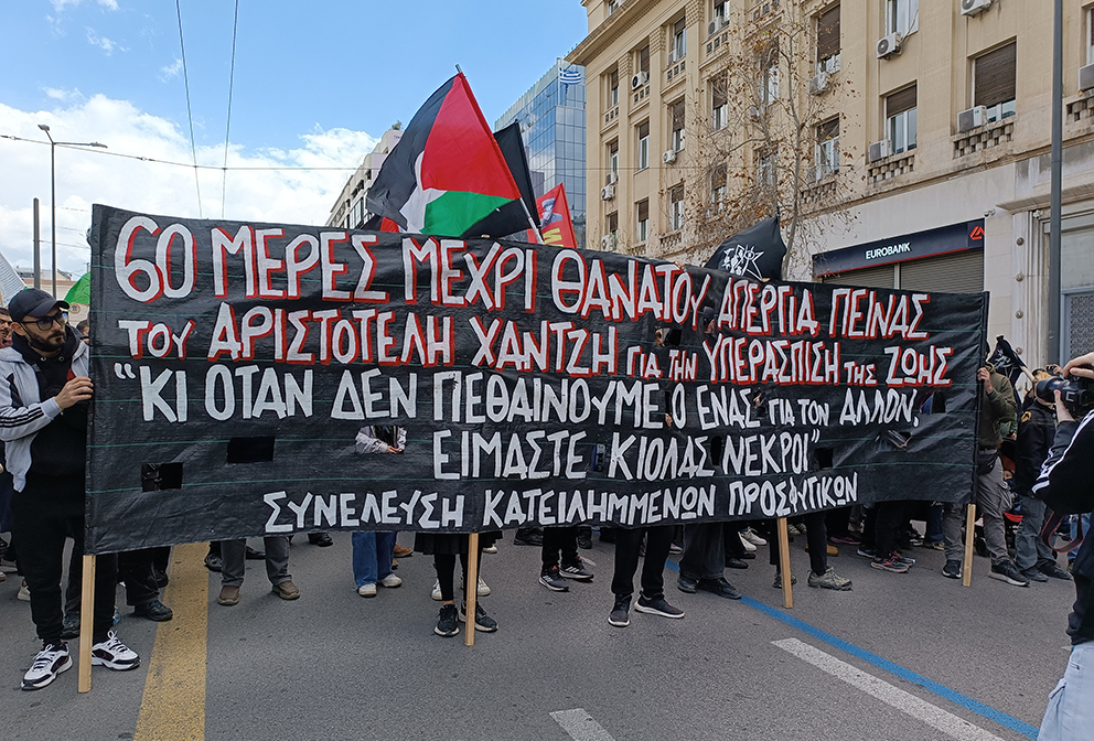 Παρενθετικά την Παρασκευή 3/4/26 ο απεργός πείνας Αρίστος Χαντζής, αφού κάλεσε για τη συμμετοχή στην συγκέντρωση στην πλ. Ελευθερίας και πορεία μέχρι την πρεσβεία των ΗΠΑ, για την ήττα του ΝΑΤΟ που έγινε το Σάββατο 4/4/26, αλλά και για την πορεία των Προσφυγικών της Κυριακής,επισκέφθηκε μαζί με άλλους συντρόφους του από τα κατειλημμένα Προσφυγικά το Α.Τ. Αμπελοκήπων. Εκεί δίνουν το μηνιαίο παρόν μετά από τις προσαγωγές που είχαν, εξ’ αιτίας της επίθεσης της αστυνομίας στην συντεταγμένη αποχώρηση από την πρεσβεία των σιωνιστών δολοφόνων, στην πορεία αλληλεγγύης της 7ης Οκτώβρη 2025 για την Παλαιστίνη.