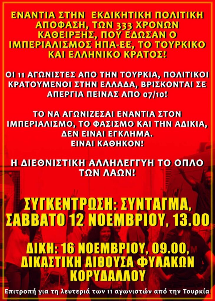 Το Εργατικό Επαναστατικό Κόμμα στέκεται στο πλευρό των 11 Τούρκων και Κούρδων αγωνιστών που μάχονται για το δίκιο και τη λευτεριά, με απεργία πείνας μέσα στις ελληνικές φυλακές από τις 7 Οκτωβρίου.