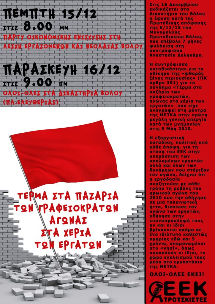 Εκδικάζεται στις 16 Δεκεμβρίου στα Δικαστήρια του Βόλου η έφεση που ασκήθηκε κατά της Πρωτόδικης απόφασης του Μονομελούς Πρωτοδικείου Βόλου (6/11/15), η οποία επέβαλε 7 μήνες φυλάκιση στη συντρόφισα Αναστασία Δεληκάρη, φοιτήτρια της Αρχιτεκτονικής σχολής στο πανεπιστήμιο Θεσσαλίας, εξαιτίας της αμέριστης στήριξης της στον αγώνα για την επαναπρόσληψη των τριών εργατών που είχαν απολυθεί το Φλεβάρη 2010 από τη ΜΕΤΚΑ εξαιτίας της συνδικαλιστικής τους δράσης.