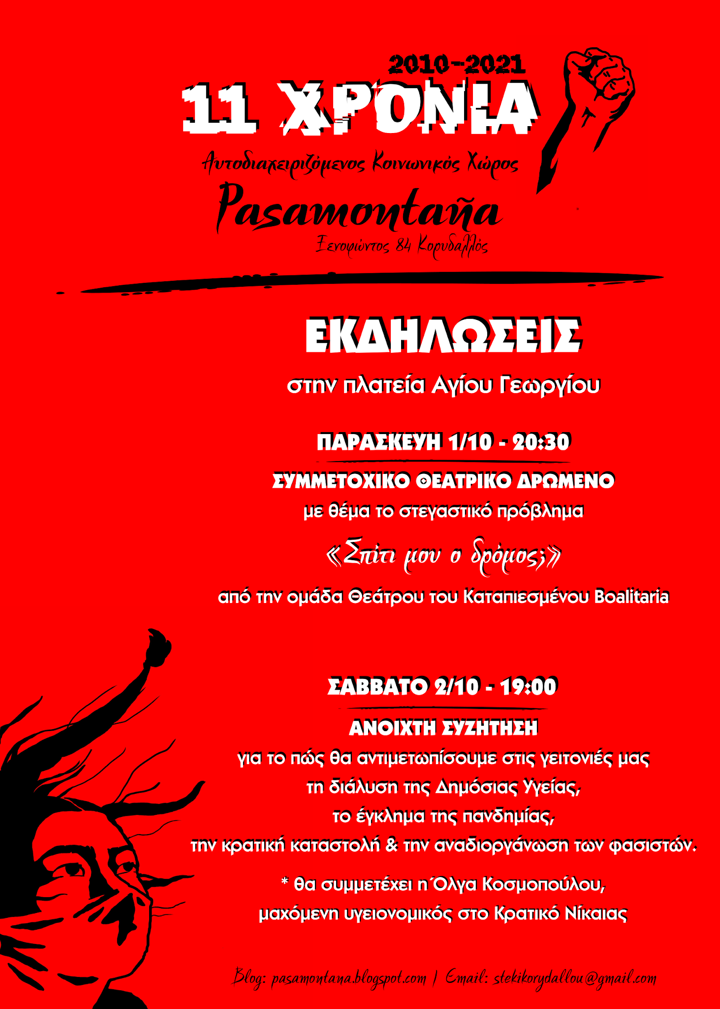 Με αφορμή τη συμπλήρωση 11 χρόνων λειτουργίας του, ο Αυτοδιαχειριζόμενος Κοινωνικός Χώρος Pasamontaña, στον Κορυδαλλό, οργανώνει ένα ενδιαφέρον διήμερο εκδηλώσεων στην πλατεία Αγ. Γεωργίου.