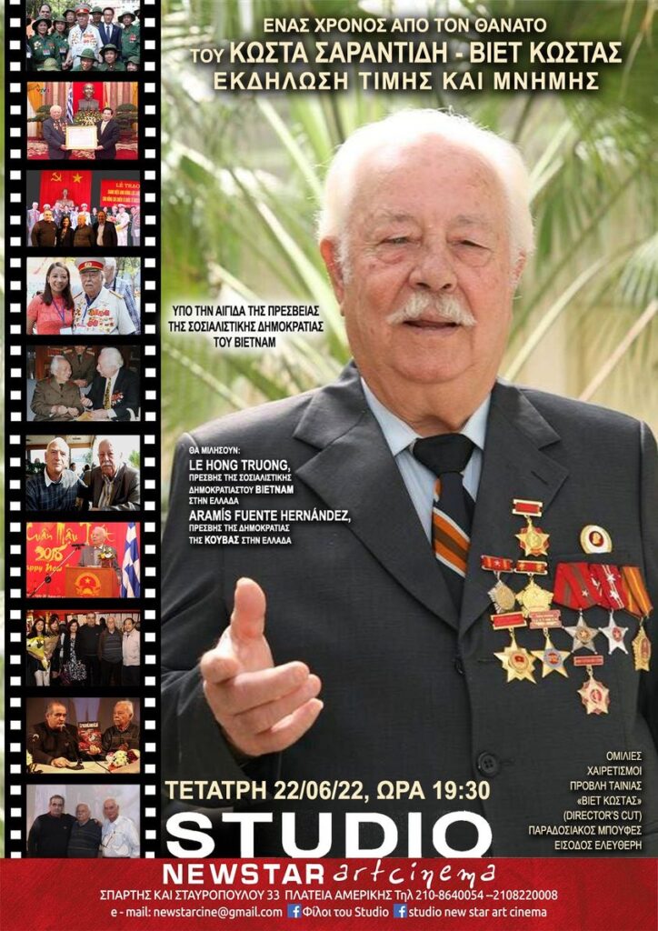 Η εκδήλωση γίνεται στον ιστορικό κινηματογράφο τέχνης και πολιτισμού STUDIO (Σπάρτης και Σταυροπούλου 33, Πλατεία Αμερικής). Θα προβληθεί η ταινία «Βιέτ Κώστας. Υπηκοότης: Ακαθόριστος» του Γιάννη Τριτσιμπίδα, ενώ θα γίνουν ομιλίες/χαιρετισμοί από τους: Le Hong Truong, πρέσβη της Σοσιαλιστικής Δημοκρατίας του Βιετνάμ στην Ελλάδα, Aramís Fuente Hernández, πρέσβη της Δημοκρατίας της Κούβας στην Ελλάδα, μέλη της οικογένειας του Βιετ Κώστα Σαραντίδη, Γιάννη Τριτσιμπίδα, σκηνοθέτη της ταινίας «Βιέτ Κώστας. Υπηκοότης: Ακαθόριστος» και Βελισσάριο Κοσσυβάκη, Καλλιτεχνικό Διευθυντή του STUDIO new star art cinema.