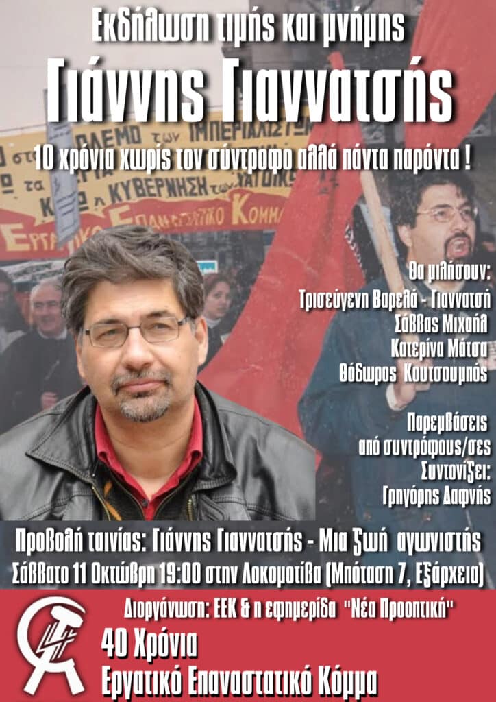 Με την συμπλήρωση 10 χρόνων απουσίας από κοντά μας, το “Εργατικό Επαναστατικό Κόμμα” και η Εφημερίδα “Νέα Προοπτική” διοργανώνουν το Σάββατο 11 Οκτώβρη στις 7 μ.μ. στην “Λοκομοτίβα” (Μπόταση 9, Εξάρχεια) εκδήλωση Τιμής και Μνήμης!