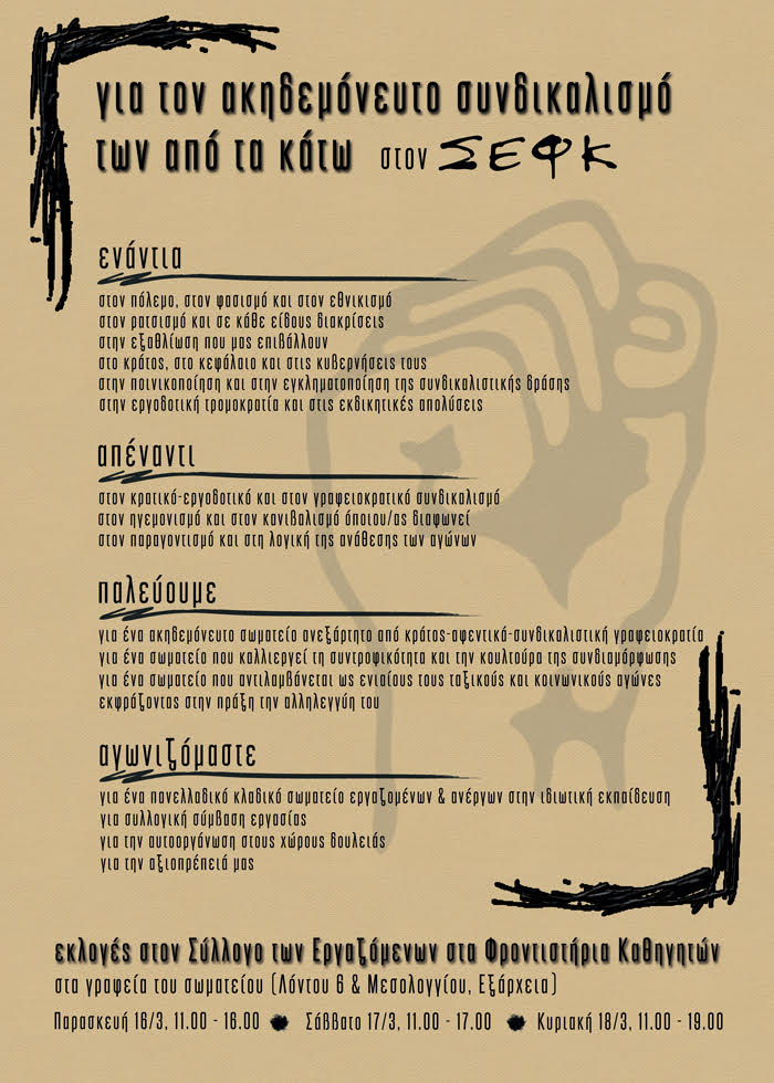 Καλούμε σε ψήφιση και στήριξη του ψηφοδελτίου «Για έναν ακηδεμόνευτο συνδικαλισμό των από τα κάτω στο ΣΕΦΚ». Για να δοθεί μια ευκαιρία για μια διαφορετική πολιτική συζήτηση στον κλάδο, υπέρ των εργαζομένων, για την κοινή δράση τους με άλλα μαχόμενα τμήματα του εργατικού κινήματος.