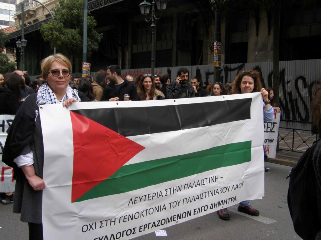 Η αλληλεγγύη των εργαζομένων στον Παλαιστινιακό λαό είναι καθήκον όλου του εργατικού και συνδικαλιστικού κινήματος και βρίσκει ανταπόκριση στα μαχόμενα στρώματα της εργατικής τάξης. Διόλου τυχαία, στην πρόσφατη μεγάλη γενική απεργία της 28/2 -χωρίς την γραφειοκρατία της ΓΣΕΕ- μαζί με τις καταγγελίες για το έγκλημα στα Τέμπη και τις διεκδικήσεις για αυξήσεις μισθών και τα άλλα εργατικά αιτήματα, τα συνθήματα αλληλεγγύης στην Παλαιστίνη, εκφράζονταν μαζικά. Το κίνημα εργατικής αλληλεγγύης στο δοκιμαζόμενο, και μαχόμενο λαό της Παλαιστίνης πρέπει να διευρυνθεί.