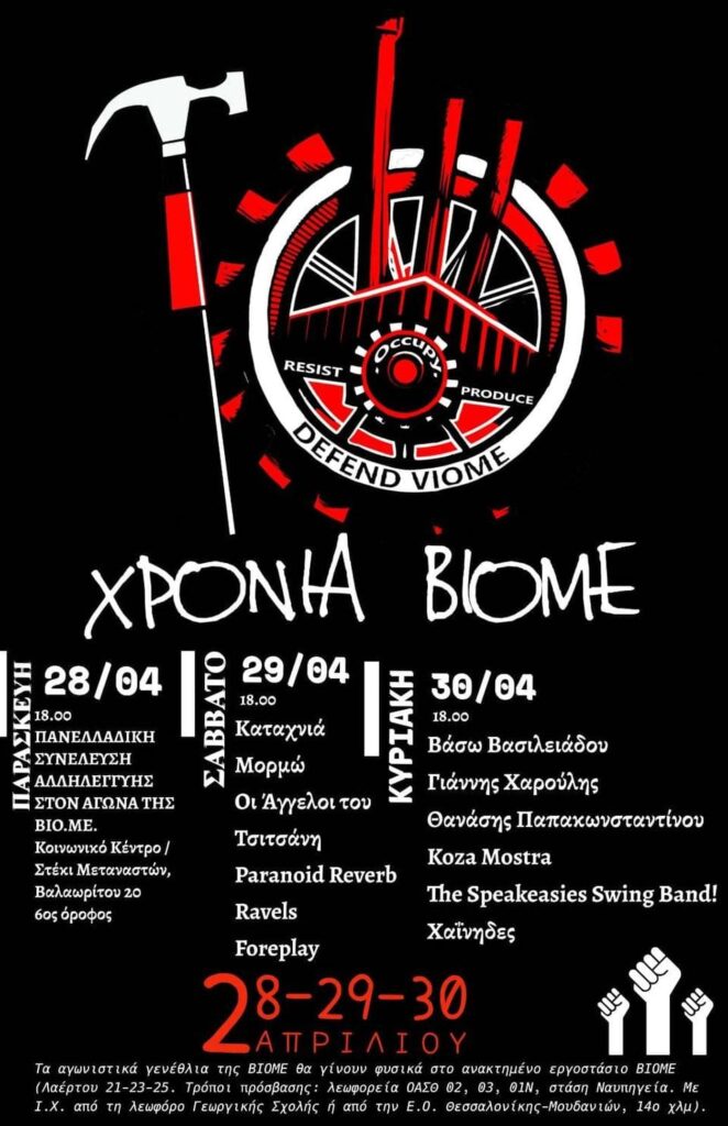 Με απόλυτη επιτυχία πραγματοποιήθηκαν και ολοκληρώθηκαν οι εκδηλώσεις για τον εορτασμό των 10 χρόνων της αυτοδιαχειριζόμενης κάτω από εργατικό έλεγχο ΒιοΜε, στους χώρους του κατειλημμένου εργοστασίου το τριήμερο 28-30/4/2023, που διοργάνωσαν οι εργάτες και η πρωτοβουλία αλληλεγγύης.