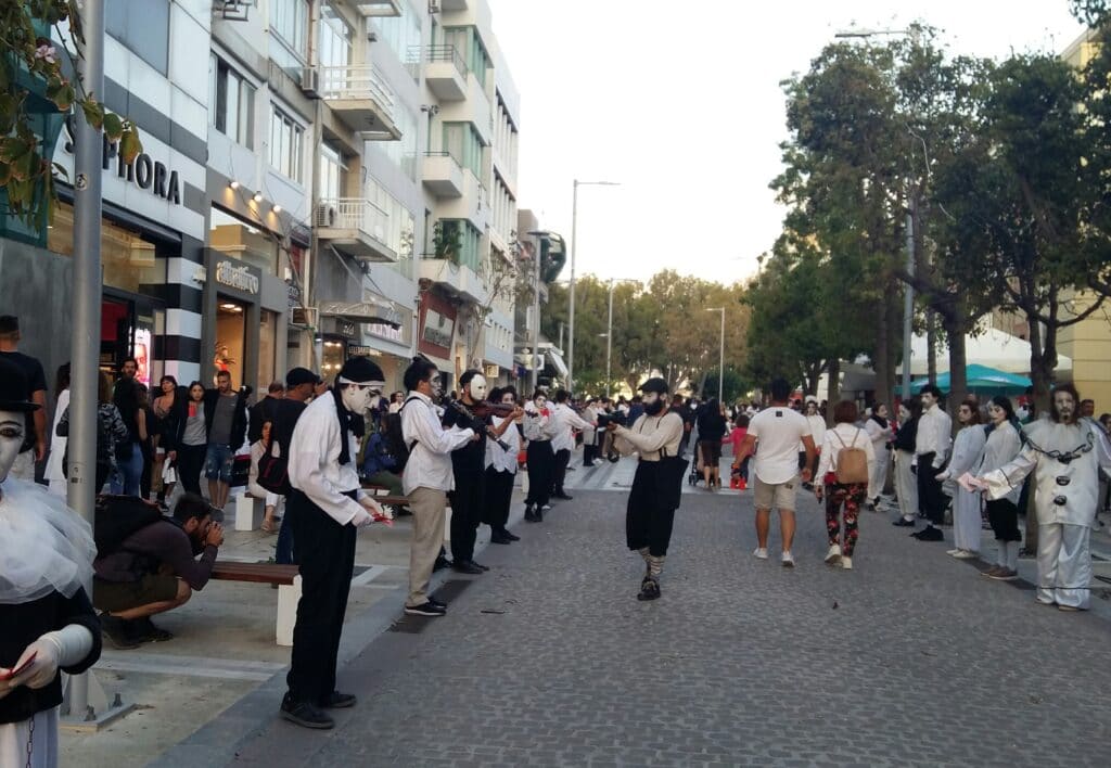 Μια εκατοντάδα κλόουν και πιερότοι μοίραζαν στους περαστικούς αντιφασιστικά και αντιρατσιστικά μηνύματα γραμμένα σε κόκκινο χαρτί.