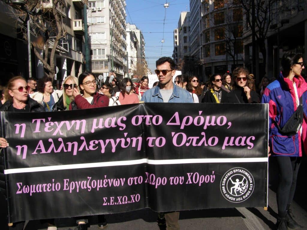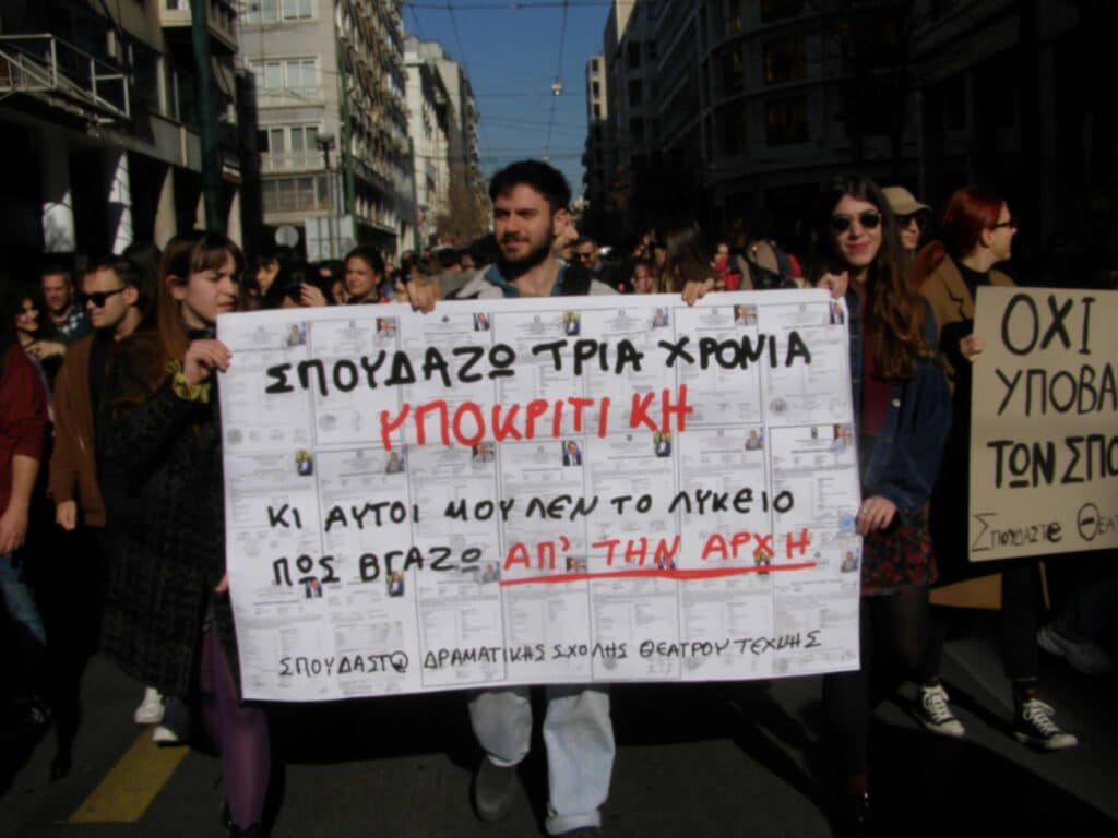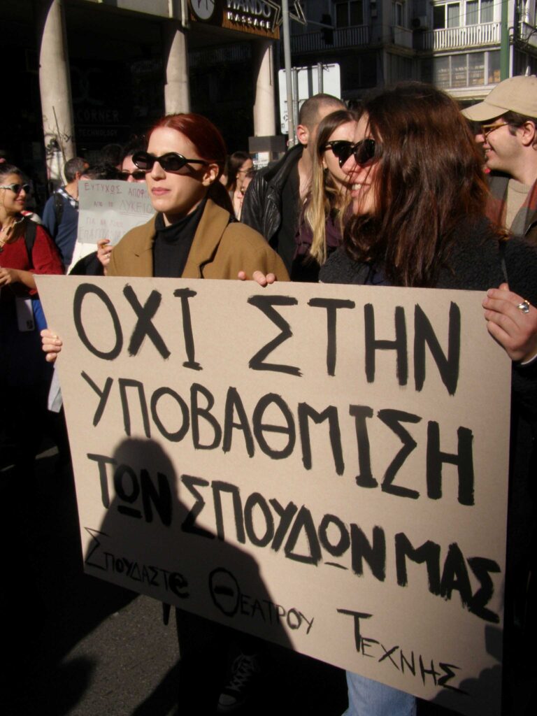 Η συγκέντρωση διαμαρτυρίας γρήγορα μετατράπηκε σε διαδήλωση προς το Σύνταγμα. Για μια ακόμα φορά οι άνθρωποι της Τέχνης βγήκαν στο δρόμο για να διαδηλώσουν ενάντια στην υποβάθμιση της ζωής τους, της τέχνης και της δουλειάς τους, απέναντι σε μια κυβέρνηση μαφιόζων, που πεισματικά καταστρέφει ό,τι δεν ωφελεί τα συμφέροντα των αφεντικών της, του μεγάλου κεφαλαίου και των επιχειρηματικών ομίλων, τους οποίους και υπηρετεί ως ο πιο πιστός εντολοδόχος. Στην προκειμένη περίπτωση πρόκειται για κολέγια συμβεβλημένα με δραματικές σχολές του εξωτερικού και ΙΕΚ, που θέλουν διακαώς να εισέλθουν στον χώρο της καλλιτεχνικής παιδείας.
