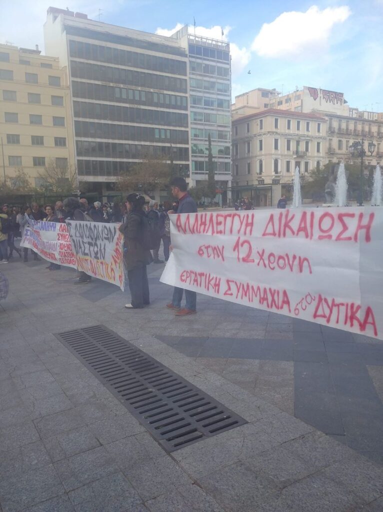 Στην πλατεία Κοτζιά, από νωρίς το απόγευμα της Τρίτης 11/4, στις 4 μμ, ήταν πλήθος κόσμου, με τα πανό των συλλογικοτήτων και των κινήσεων από τον χώρο των αγωνιζόμενων καλλιτεχνών και τις συνοικίες. Ανάμεσα στους συγκεντρωμένους ήταν και οι σύντροφοι της Εργατικής Συμμαχίας στα Δυτικά, κρατώντας το πανό της εργατικής αυτής συλλογικότητας, σε αλληλεγγύη στην 12χρονη και τους δικούς της.