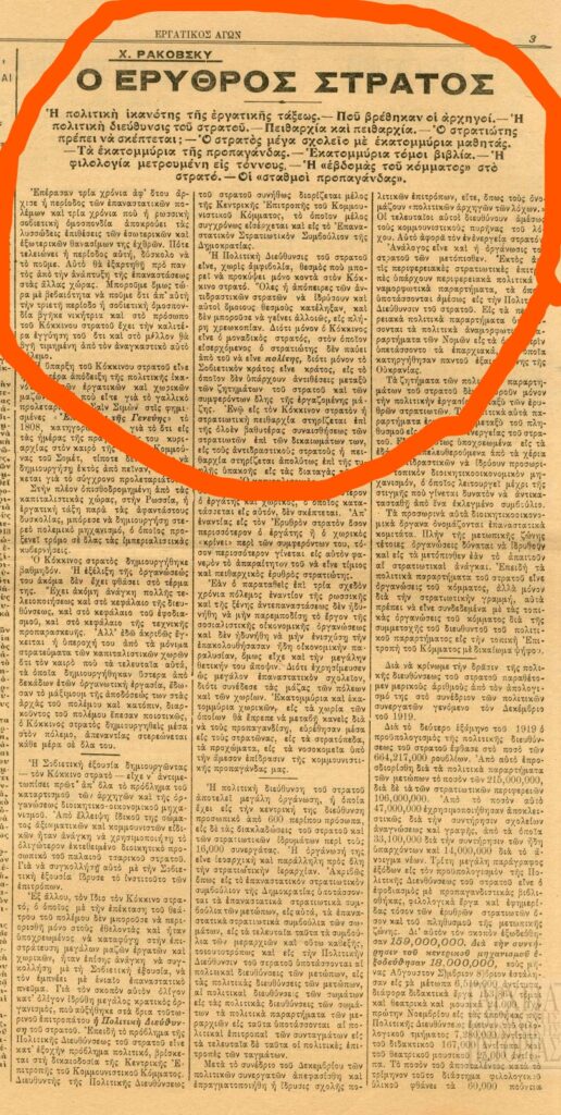 Η 23 η Φεβρουαρίου έχει καθιερωθεί ως Μέρα του Κόκκινου Στρατού που ιδρύθηκε τον Ιανουάριο του 1918. Η Νέα Προοπτική δημοσιεύει το παρακάτω κείμενο του Κριστιάν Ρακόβσκι, γραμμένο το 1920. Το άρθρο είχε δημοσιευτεί για πρώτη φορά στα ελληνικά στην εφημερίδα Εργατικός Αγώνας, όργανο του ΣΕΚΕ, με διευθυντή τον δολοφονημένο, τον Οκτώβρη του 1920, ηγέτη Δημοσθένη Λιγδόπουλο. Ημερομηνία της πρώτης δημοσίευσης στα ελληνικά η 25η Απριλίου 1921. Εδώ σε καινούργια μετάφραση από τα αγγλικά.