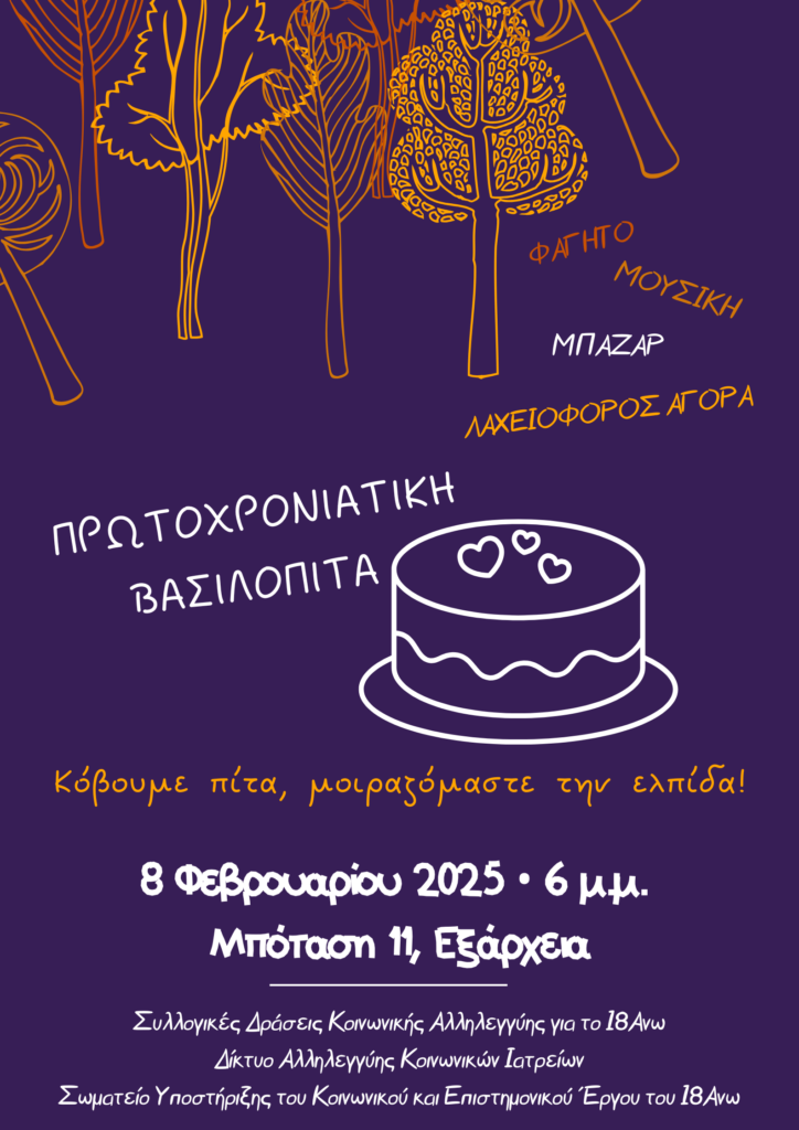 Το Σάββατο 8 Φεβρουαρίου, στις 18:00, οι Συλλογικές Δράσεις Κοινωνικής Αλληλεγγύης για το 18 Άνω, το Σωματείο Υποστήριξης του Επιστημονικού και Κοινωνικού Έργου του 18Άνω και το Δίκτυο Αλληλεγγύης Κοινωνικών Ιατρείων μας καλούν στην κοπή της πίτας, στα γραφεία του Σωματείου (Μπόταση 11, Εξάρχεια). Μαζί με την πίτα θα υπάρχει συζήτηση, μοίρασμα στιγμών, διασκέδαση και δημιουργία δεσμών αλληλεγγύης και ανθρωπιάς! Μαζί με φαγητό, μουσική, δώρα και άλλα δρώμενα…