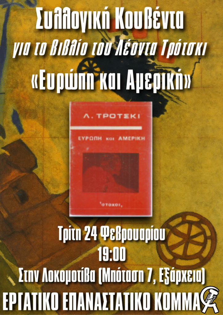 Την Τρίτη 24 Φεβρουαρίου, 19:00 στην Λοκομοτίβα (Μπόταση 7, Εξάρχεια) ο πυρήνας Κερατσινίου του Εργατικού Επαναστατικού Κόμματος ξεκινάει τον νέο κύκλο συλλογικών συζητήσεων, αυτήν τη φορά πάνω στο βιβλίο του Λέοντα Τρότσκι «Ευρώπη και Αμερική», ως συνδετικό κρίκο με τον προηγούμενο κύκλο διαβάσματος του βιβλίου «Ο ιμπεριαλισμός, ανώτατο στάδιο του καπιταλισμού» του Β.Ι. Λένιν που είχε πραγματοποιηθεί την περσινή χρονιά. Αυτήν την στιγμή, όπου όλες οι αντιφάσεις μεταξύ του Αμερικανικού και του Ευρωπαϊκού ιμπεριαλισμού ξεκαθαρίζουν ενώ για πολλούς για δεκαετίες αποτελούσαν ένα κοινό σώμα, το βιβλίο του Λέοντα Τρότσκι, ιδρυτή του Κόκκινου Στρατού και πρωτεργάτη της Οκτωβριανής Επανάστασης, φαίνεται σχεδόν προφητικό καθώς καταδεικνύει τα αντίπαλα συμφέροντα μεταξύ Αμερικής και Ευρώπης. Συμφέροντα που -όπως έγραψε και ο ίδιος σαν ενδεχόμενο- μπορούν να παραμερίστηκαν λόγω του κινδύνου εξάπλωσης της Οκτωβριανής Επαναστασης στον υπόλοιπο πλανήτη, επικαλύπτοντας όμως η Αμερική την Ευρώπη σε μεγάλο βαθμό, όπως και έγινε.