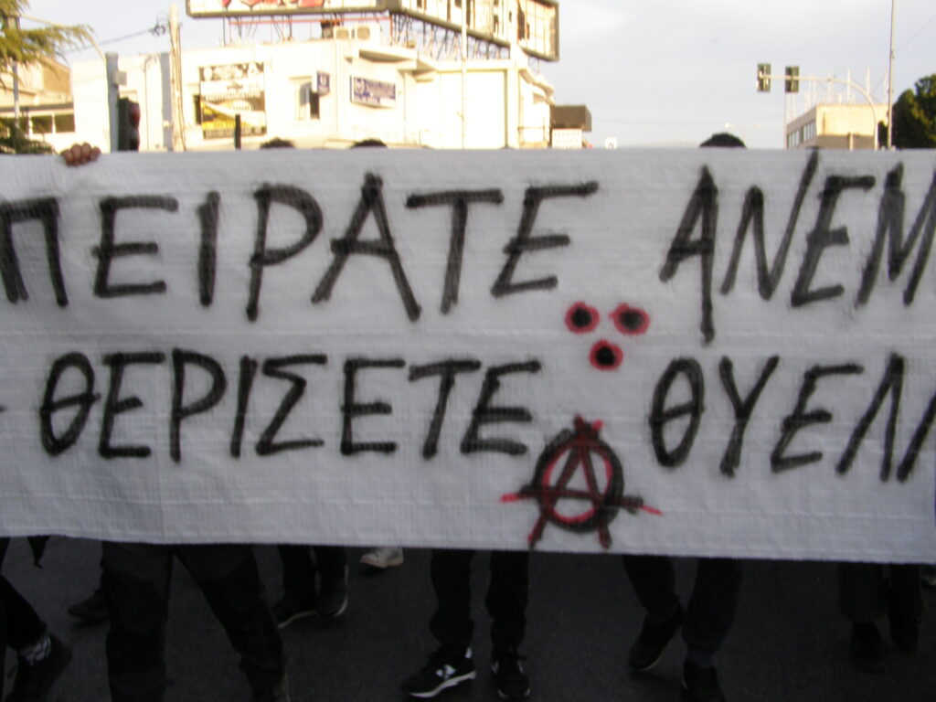 «Μπάτσοι, tv, νεοναζί, όλα τα καθάρματα δουλεύουνε μαζί», «Λεφτά για την υγεία, λεφτά για την παιδεία, όχι για κανάλια και την αστυνομία», «φασίστα σκουπίδι Χρυσοχοΐδη», «Εμπρός λαέ μην σκύβεις το κεφάλι, ο μόνος δρόμος είναι αντίσταση και πάλη», «το πάθος για τη λευτεριά είναι δυνατότερο απ’ όλα τα κελιά», ήταν μερικά από τα συνθήματα.