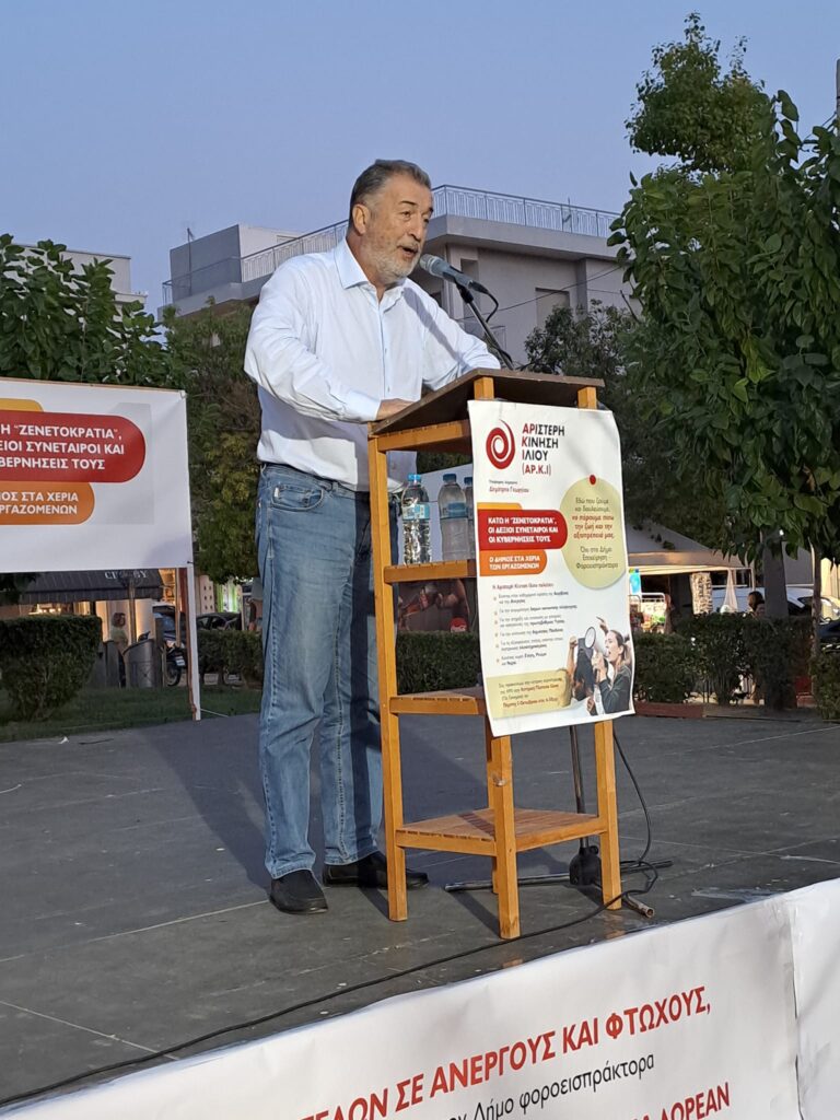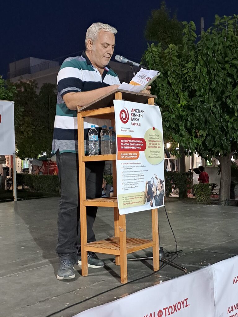 Βασικός ομιλητής ήταν ο υποψήφιος δήμαρχος της Αρ.Κ.Ι. σύντροφος Δημήτρης Γεωργίου. Κάτω η κυβέρνηση Μητσοτάκη, κάτω η Ζενετοκρατία, είπε.