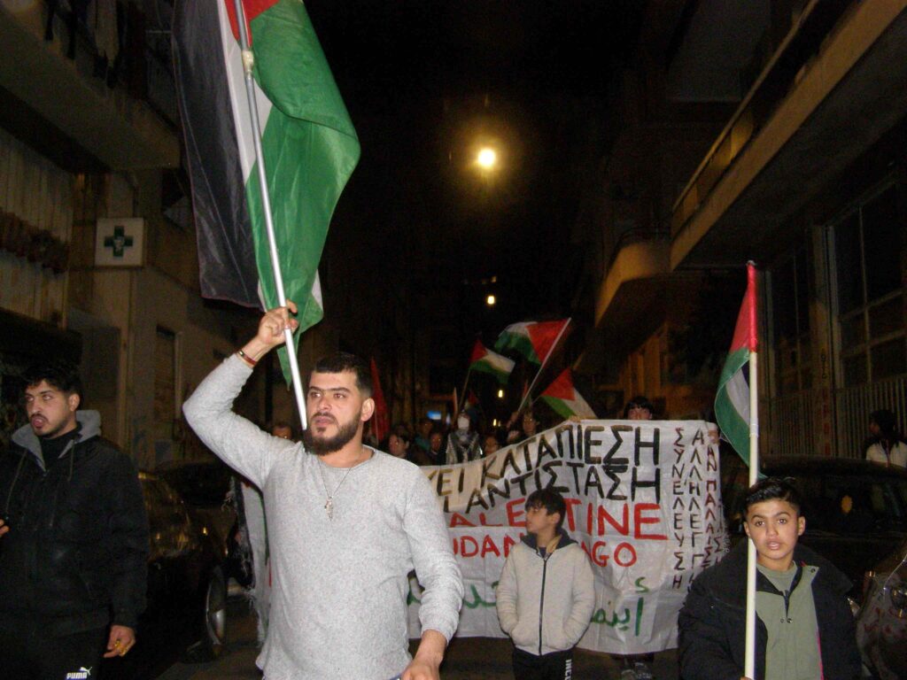 Ήταν μια δυναμική και μαχητική διαδήλωση πάνω από 100 Παλαιστινίων και Ελλήνων αλληλέγγυων που αρχικά συγκεντρώθηκαν στην πλατεία Βικτωρίας. Εκεί, φώναξαν συνθήματα και τραγούδησαν αραβικά επαναστατικά τραγούδια, ενώ στους περαστικούς μοιραζόταν το κείμενο προκήρυξης.