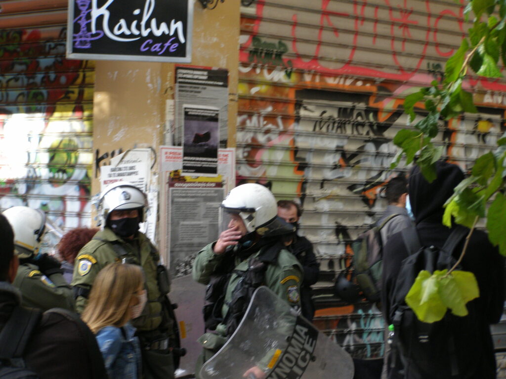 Ένας άνδρας της ΟΠΚΕ έδειξε εμένα και τους δύο συντρόφους και αμέσως μας πλησίασε και μας περικύκλωσε η ομάδα τους. Ζήτησαν ταυτότητες και το μήνυμα μετακίνησης. Ένας εξ αυτών μας είπε ότι απαγορεύεται να φωνάζουμε συνθήματα, καθώς «Έτσι λέει ο Μιχάλης». Η προσαγωγή μας δεν άργησε να έρθει. Μαζί με άλλο κόσμο που βρισκόταν στην πλατεία, μας πήγαν στην άκρη, όπου περιμέναμε τα οχήματα που θα μας μετέφεραν στη ΓΑΔΑ.