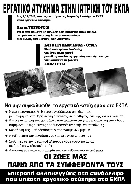 Μερικούς μήνες μόνο μετά το ατύχημα στα ΕΛΠΕ που κόστισε τη ζωή σε τέσσερεις ανθρώπους αλλά ακόμη δεν έχουν αποδοθεί ευθύνες, τον Δεκέμβριο του 2015 στην Ιατρική Σχολή ο συνάδελφος Οδυσσέας Βογιατζής παρά λίγο να χάσει τη ζωή του εξ αιτίας των απαράδεκτων συνθηκών εργασίας και των ελλείψεων σε μέτρα ασφαλείας.