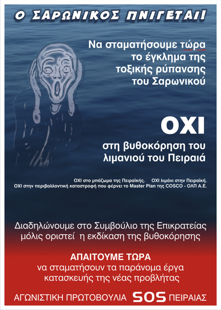Η SOS Πειραιάς δηλώνει την πρόθεσή της να πάρει σχετικές πρωτοβουλίες ώστε να υπάρχει άμεσα δυναμική παρέμβαση του λαού, των συνδικάτων, των περιβαλλοντικών οργανώσεων και των κινήσεων πολιτών ώστε οργανωμένα – συντονισμένα να ξεδιπλωθεί το αμέσως επόμενο διάστημα μια μεγάλη μαζική – λαϊκή αντίδραση που θα ματαιώσει τα σχέδια της Cosco και των πολιτικών δυνάμεων (Ν.Δ – ΣΥΡΙΖΑ – ΚΙΝΑΛ) που της παραχώρησαν το λιμάνι και πολιτικά στηρίζουν τα επιχειρηματικά της – τερατώδη σχέδια.