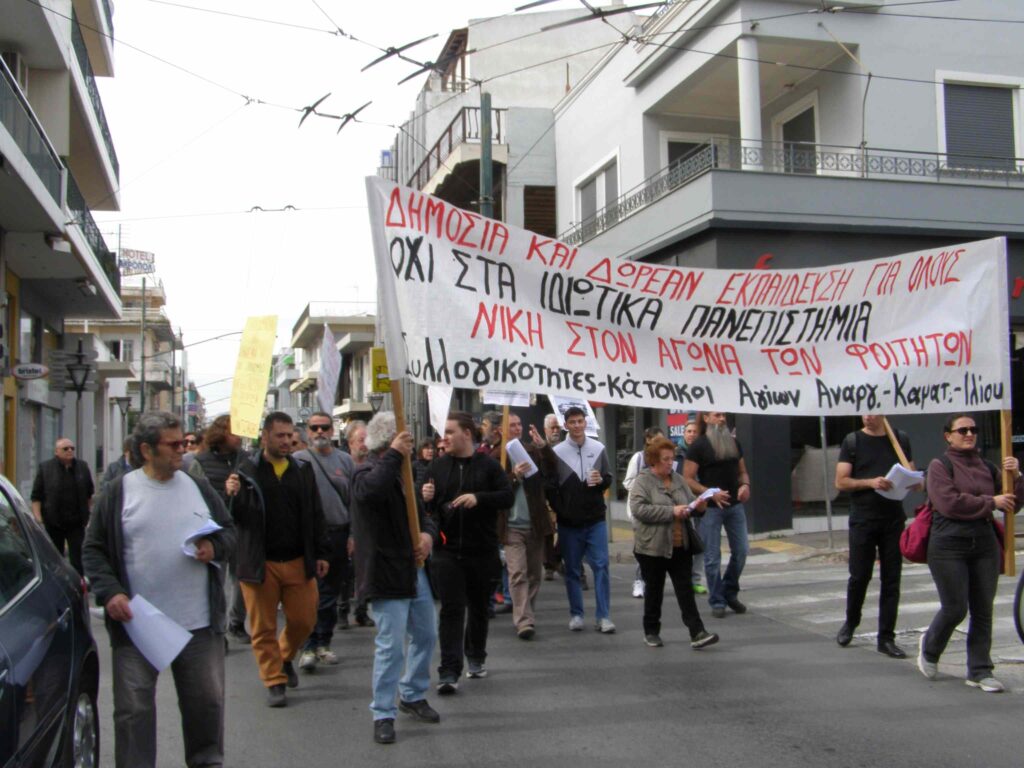 Με δυναμισμό, ταξική αποφασιστικότητα και οργή, ενάντια στην κυβέρνηση του κεφαλαίου και το σχεδιαζόμενο νομοσχέδιο διάλυσης της δημόσιας παιδείας, ίδρυσης ιδιωτικών “αει” και ουσιαστικά κλεισίματος των Δημόσιων Πανεπιστημίων, η διαδήλωση άρχισε μετά την συγκέντρωση στην κεντρική πλατεία, όπου η Αριστερή Κίνηση Ιλίου (ΑΡ.Κ.Ι.) είχε ανοιγμένο το πανό της, ενώ μοιράζονταν εκατοντάδες προκηρύξεις στους κατοίκους της περιοχής, εκ μέρους της Αριστερής Κίνησης Ιλίου, της Εργατικής Συμμαχίας στα Δυτικά, της Πρωτοβουλίας για μαθήματα ενισχυτικής διδασκαλίας, του Κοινωνικού Ιατρείου Αλληλεγγύης Ιλίου και των Δρόμων Αντίστασης. Στη διάρκεια της πορείας, που έγινε από το κέντρο του Ιλίου συνεχίζοντας στον κεντρικό δρόμο που συνδέει την περιοχή με τους Άγ. Ανάργυρους, οι διαδηλωτές, κρατώντας πλακάτ που είχαν πάνω συνθήματα υπεράσπισης του φοιτητικού αγώνα, φώναζαν διαρκώς συνθήματα υπεράσπισης, υποστήριξης και νίκης στον αγώνα των φοιτητών και της νεολαίας, που είναι όσο ποτέ αναγκαίο να γίνει υπόθεση όλης της εργατικής τάξης και του λαού. Την εκδήλωση της αλληλεγγύης τους και της υποστήριξης στην πορεία, έδιναν κατά τη διάρκειά της, εκατοντάδες εργαζόμενοι, μετανάστες, νέοι και συνταξιούχοι της περιοχής, δίνοντας ένα πρώτο στίγμα του τι μπορεί και πρέπει να ακολουθήσει απέναντι στην κυβέρνηση του ταξικού εχθρού και για την ανατροπή της.
