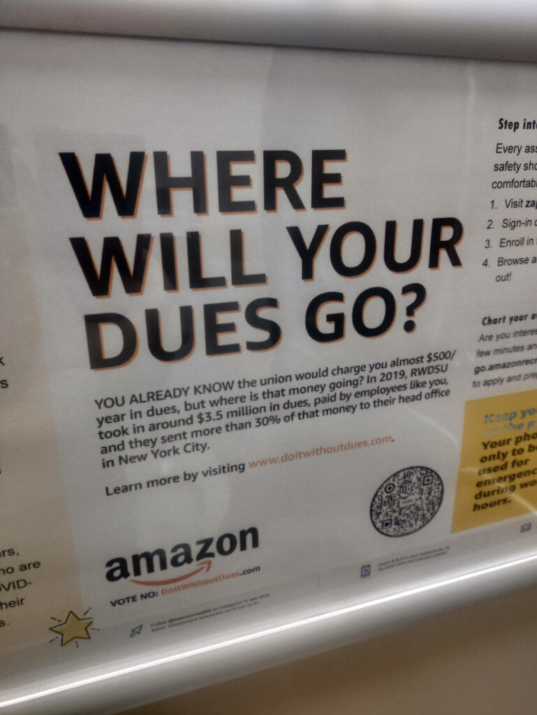 Σε μια αρκετά εμφανίσιμη ιστοσελίδα, που δημιούργησε η εργοδοσία, DoItWithoutDues.com, ευτυχείς εργάτες δείχνουν χαρούμενοι και ικανοποιημένοι που δουλεύουν στην εν λόγω εταιρεία. Επίσης μαθαίνουμε από την Amazon ότι η ένταξη σε ένα σωματείο δεν προσφέρει καμία εγγύηση για την ασφάλεια της εργασίας ή καλύτερους μισθούς και οφέλη. Φυσικά δεν αναφέρεται στο πώς υπονομεύει η εργοδοσία όλα τα παραπάνω.
