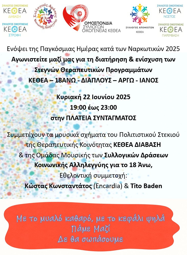 Καλούμε ολόκληρη την πάσχουσα κοινωνία να δώσει μαζί μας τη μάχη για να καταργηθεί ο νόμος 5129/24 και να εξασφαλισθεί η απρόσκοπτη λειτουργία όλων των στεγνών θεραπευτικών προγραμμάτων απεξάρτησης.