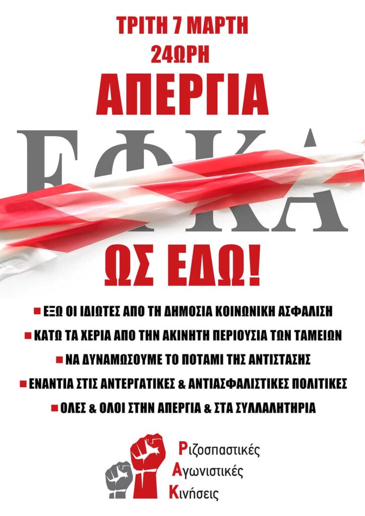 Οι εργαζόμενοι στα ασφαλιστικά ταμεία απεργούν την Τρίτη 7 Μαρτίου. Με προκήρυξή τους οι ΡΙΖΟΣΠΑΣΤΙΚΕΣ ΑΓΩΝΙΣΤΙΚΕΣ ΚΙΝΗΣΕΙΣ καλούν σε αγώνα διαρκείας και συμμετοχή στο συλλαλητήριο στο υπουργείο Εργασίας. Ολόκληρη η ανακοίνωση: