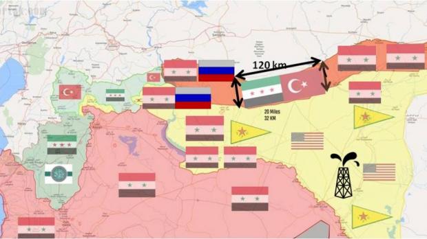 Αυτή η συμφωνία επίσης εκθέτει το γεγονός ότι μια ασφαλής ζώνη με την ταυτότητα ενός διαδρόμου του ΝΑΤΟ είναι μέρος του Αμερικάνικου σχεδίου. Δεν μας εκπλήσσει το γεγονός ότι η μεγαλύτερη υποστήριξη στην επιχείρηση της Πηγής Ειρήνης ήρθε από τον Γενικό Γραμματέα του ΝΑΤΟ Στόλτενμπεργκ. Πράγματι η τελευταία συμφωνία ξεκάθαρα δηλώνει ότι οι ΗΠΑ και η Τουρκία θα δουλέψουν σε συνεργασία για την ασφαλή ζώνη. Ο αντιπρόεδρος των ΗΠΑ Πενς προσωπικά έδωσε έμφαση ότι η ζώνη θα είναι 20 μίλια (32 χλμ) βαθειά. Οι δυνάμεις των ΥPG θα αποσυρθούν από την περιοχή σαν μέρος της συμφωνίας. Εντούτοις, η συγκεκριμένη κατάσταση στο έδαφος δηλώνει ότι η συμφωνία ίσως είναι σε ισχύ μόνο για την γραμμή των 120 χλμ του Τελ Αμπγιάντ-Ρας αλ-Αΐν. Πράγματι μετά την συμφωνία ανάμεσα στις SDF2 και τον Ασσάντ, Συριακές και σε ορισμένες Ρωσικές περιοχές, δυνάμεις είναι ήδη ανεπτυγμένες στο Μανμπίτζ, το Κομπάνι και το Καμισλί. Ο Τούρκος Υπουργός Εξωτερικών Μεβλούτ Τσαβούσογλου, το επιβεβαίωσε στη δήλωσή του ότι «θα συναντηθούμε με την Ρωσία για αυτές τις περιοχές». Το σχέδιο του Ερντογάν να δημιουργήσει μια ασφαλή ζώνη από τον Ευφράτη, αρχίζοντας από την Μανμπίτζ, μέχρι τα σύνορα με το Ιράκ, έχει ήδη αποτύχει. Λόγω του πολιτικού τοπίου που αναπτύχθηκε πριν, θα είναι δύσκολο να φτάσει σε μια συμφωνία με την Ρωσία, καθώς ήδη απαιτεί η Τουρκία να επιστρέψει όλη την συνοριακή γραμμή προς την Συρία. Η Τουρκική πλευρά έχει να παλέψει πολύ να κρατήσει την γραμμή των 120 χλμ του Τελ Αμπγιάντ-Ρας αλ –Αΰν στη συνάντηση στο Σότσι με τον Πούτιν στις 22 Οκτώβρη. Δεν είναι καθόλου απίθανο αυτή η κρίση στα ανατολικά του Ευφράτη να πυροδοτήσει μια άλλη σύγκρουση στο Iντλίμπ.