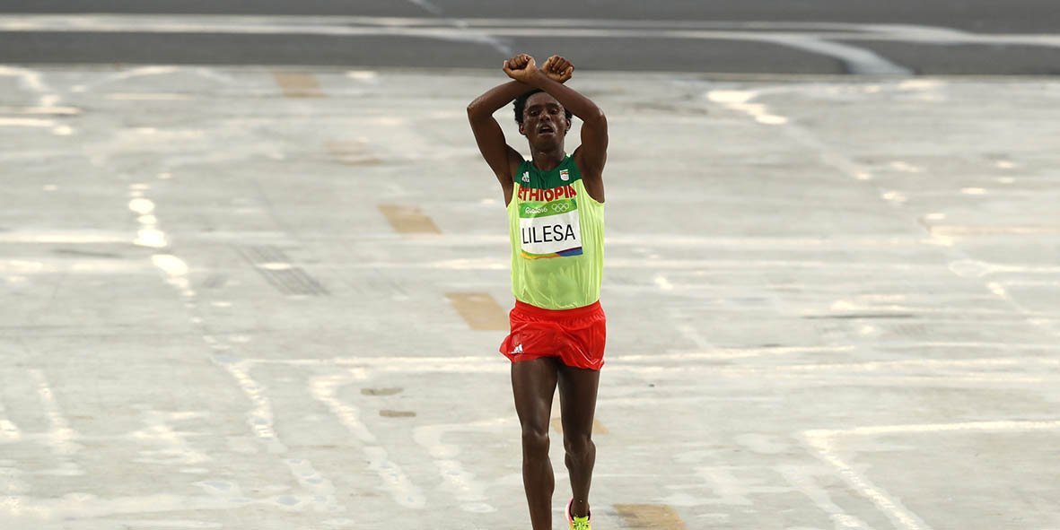 Ο Feyisa Lilesa το ήξερε: όλες οι κάμερες, όλα τα φλας, εστίαζαν πάνω του. Ο Αιθίοπας αθλητής θα διέσχιζε σε λίγο τη γραμμή τερματισμού, σε 02:09:54, στον μαραθώνιο των 42.195 χιλιομέτρων των Ολυμπιακών Αγώνων στο Ρίο. Ήρθε δεύτερος, λίγο πάνω από ένα λεπτό πίσω από το νικητή, τον Κενυάτη Έλιουντ Κιτπσόγκε (02:08:44).