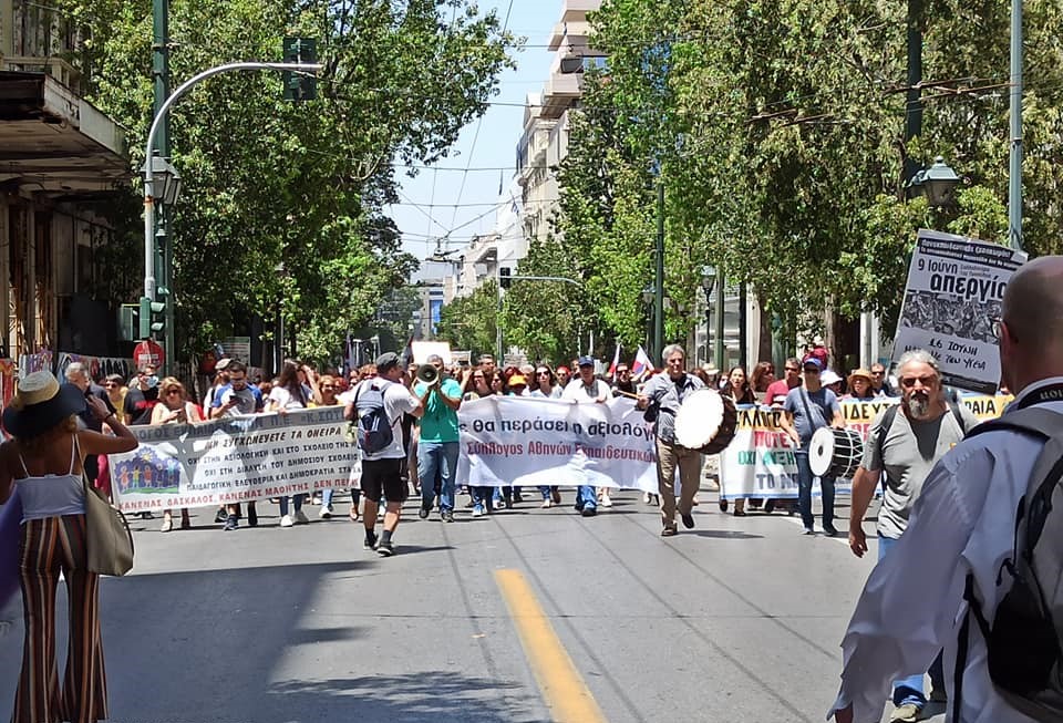 Πάνω από 3000 απεργοί εκπαιδευτικοί και νεολαία διαδήλωσαν στην Αθήνα την Τρίτη 9 Ιουνίου, στην απεργιακή πορεία με επικεφαλής τους συλλόγους εκπαιδευτικών πρωτοβάθμιας (ΣΕΠΕ) και τις ΕΛΜΕ. Η πορεία που άρχισε από τα Προπύλαια λίγο μετά την έναρξη της συγκέντρωσης, είχε πυκνά μπλοκ των σωματείων. Με μπλοκ ήταν και το Συντονιστικό Αναπληρωτών και Αδιόριστων Εκπαιδευτικών, η Ομοσπονδία Ένωσης Γονέων, οι φοιτητικοί σύλλογοι, μαθητές. Έντονη ήταν η παρουσία των απεργών εργαζόμενων από τις περιοχές της Δυτικής Αθήνας, από τα Λιόσια, το Περιστέρι, το Αιγάλεω, την Αγία Βαρβάρα αλλά και τον Πειραιά. Στη διαδήλωση επίσης ήταν και ορισμένοι εργαζόμενοι από άλλους εργασιακούς χώρους σε ένδειξη ταξικής ενότητας με τους απεργούς.