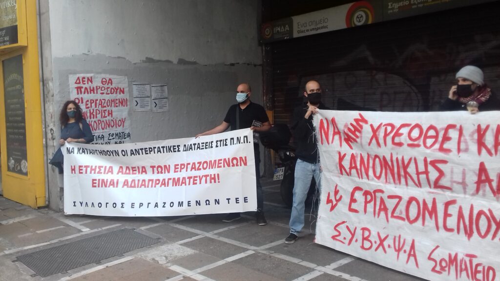 Με επιτυχία πραγματοποιήθηκε την Τετάρτη 21/10/2020 η παρέμβαση Σωματείων Δημόσιου και Ιδιωτικού τομέα έξω από το Υπουργείο Εργασίας για να μην χρεωθεί καμμία ημέρα κανονικής άδειας σε εργαζόμενους γονείς για τις Άδειες Ειδικού Σκοπού.