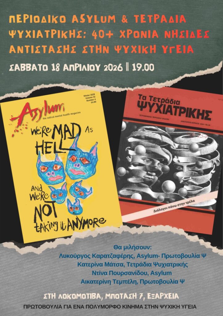 Με αφορμή τη συμπλήρωση των 40+ χρόνων από την κυκλοφορία του Asylum – The Radical Mental Health Magazine στο Ηνωμένο Βασίλειο και της σειράς Τετράδια Ψυχιατρικής στην Ελλάδα, σας προσκαλούμε σε μια εκδήλωση που επιχειρεί να ανοίξει έναν κριτικό διάλογο γύρω από τη συμβολή τους στον χώρο της ψυχικής υγείας.