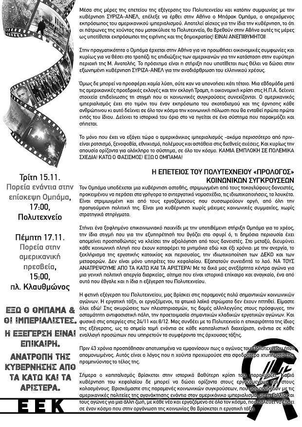 Μέσα στις μέρες της επετείου της εξέγερσης του Πολυτεχνείου και κατόπιν συμφωνίας με την κυβέρνηση ΣΥΡΙΖΑ-ΑΝΕΛ, επέλεξε να έρθει στην Αθήνα ο Μπάρακ Ομπάμα, ο απερχόμενος εκπρόσωπος του αμερικανικού ιμπεριαλισμού. Αποτελεί αίσχος για την ίδια την κυβέρνηση, το ότι οι πάτρωνες της χούντας που ματοκύλισε το Πολυτεχνείο, θα βρεθούν στην Αθήνα αυτές τις μέρες ως υποτίθεται εκπρόσωποι της ειρήνης και της δημοκρατίας! ΕΙΝΑΙ ΑΝΕΠΙΘΥΜΗΤΟΙ!