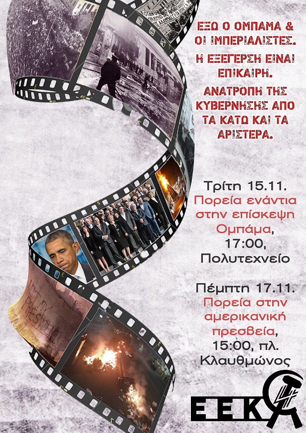 Μέσα στις μέρες της επετείου της εξέγερσης του Πολυτεχνείου και κατόπιν συμφωνίας με την κυβέρνηση ΣΥΡΙΖΑ-ΑΝΕΛ, επέλεξε να έρθει στην Αθήνα ο Μπάρακ Ομπάμα, ο απερχόμενος εκπρόσωπος του αμερικανικού ιμπεριαλισμού. Αποτελεί αίσχος για την ίδια την κυβέρνηση, το ότι οι πάτρωνες της χούντας που ματοκύλισε το Πολυτεχνείο, θα βρεθούν στην Αθήνα αυτές τις μέρες ως υποτίθεται εκπρόσωποι της ειρήνης και της δημοκρατίας! ΕΙΝΑΙ ΑΝΕΠΙΘΥΜΗΤΟΙ!