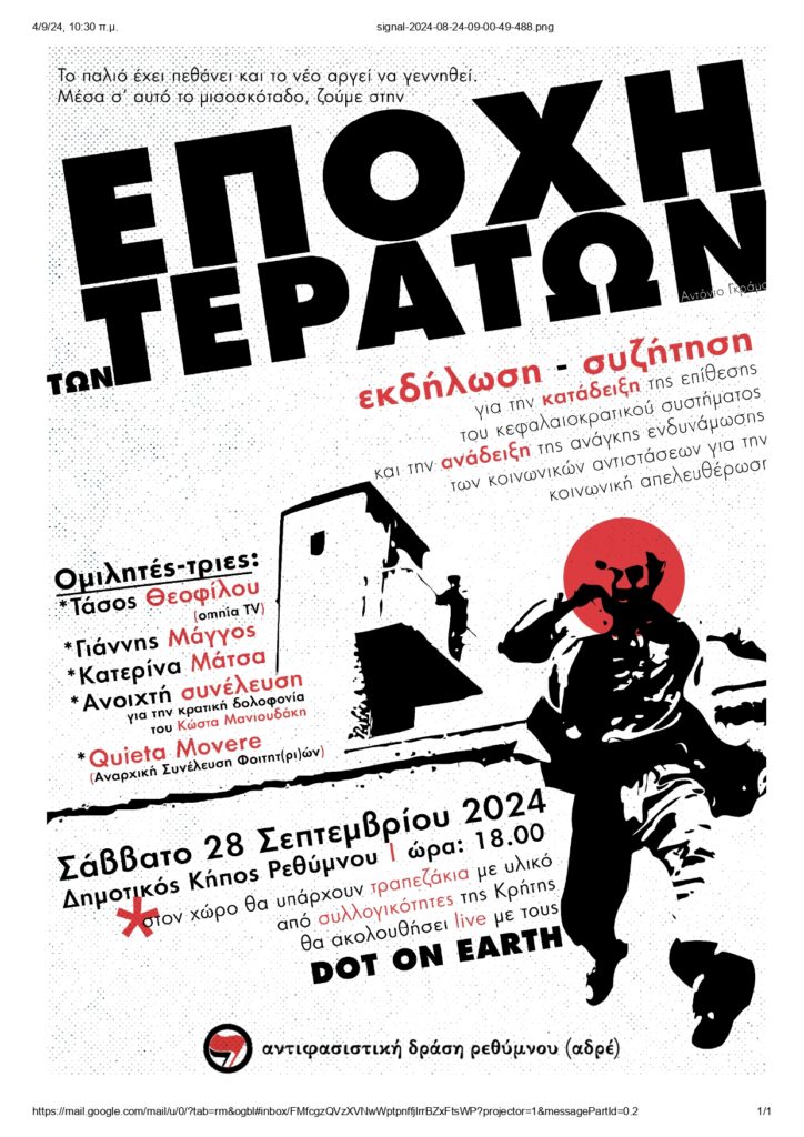 Συλλογικότητες του Ρεθύμνου οργανώνουν το Σάββατο 28/9/2024 στον Δημοτικό Κήπο της πόλης μια σημαντική πολιτική εκδήλωση ενάντια στην καταστολή και τη σύγχρονη βαρβαρότητα. Ομιλητές οι: Τάσος Θεοφίλου OmniaTV, Γιάννης Μάγγος, Κατερίνα Μάτσα, Ανοιχτή Συνέλευση για τη δολοφονία του Κώστα Μανιουδάκη, Quieta Movere (Αναρχική Συνέλευση Φοιτητ(ρι)ών).