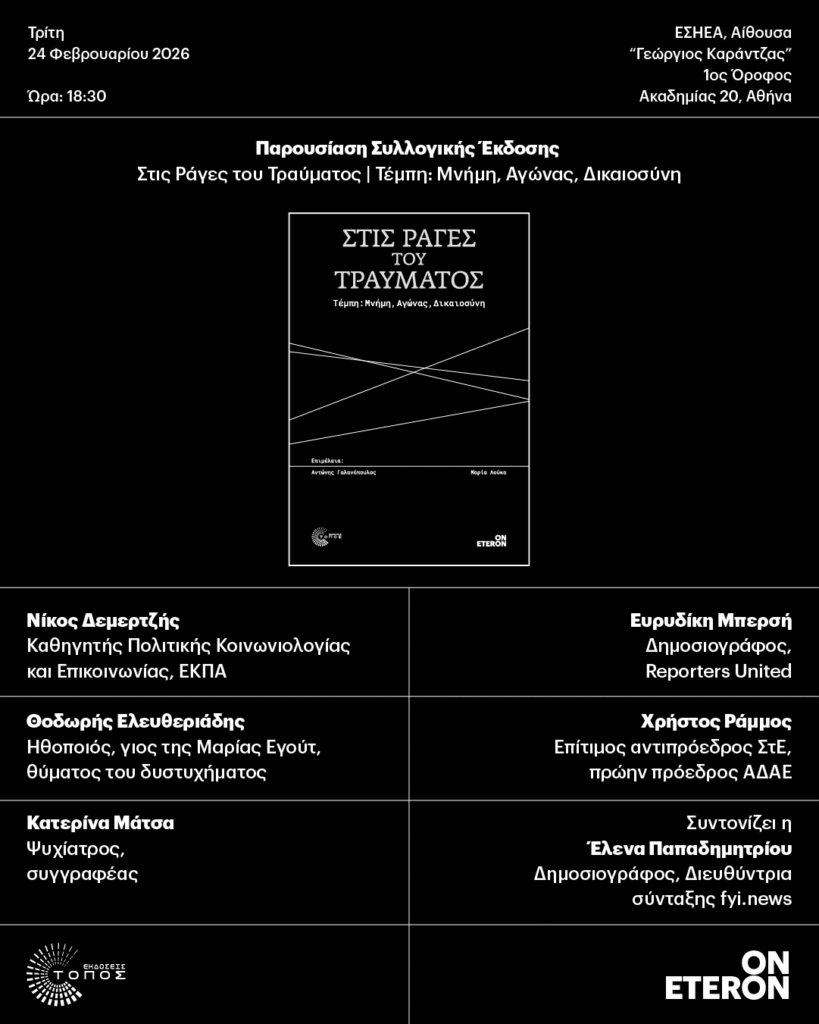 Την Τρίτη 24 Φεβρουαρίου στις 6:30 μ.μ., στην ΕΣΗΕΑ (Ακαδημίας 20, 1ος όροφος), διεξάγεται μια σημαντική κι επίκαιρη συζήτηση για το ανοικτό τραύμα, το έγκλημα των Τεμπών του 2023, με την παρουσίαση του συλλογικού βιβλίου ΣΤΙΣ ΡΑΓΕΣ ΤΟΥ ΤΡΑΥΜΑΤΟΣ | Τέμπη: Μνήμη, Αγώνας, Δικαιοσύνη (εκδόσεις Τόπος 2025). Η εκδήλωση γίνεται ελάχιστες μέρες πριν την παλλαϊκή κινητοποίηση του Σαββάτου 28 Φεβρουαρίου.