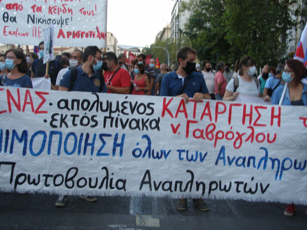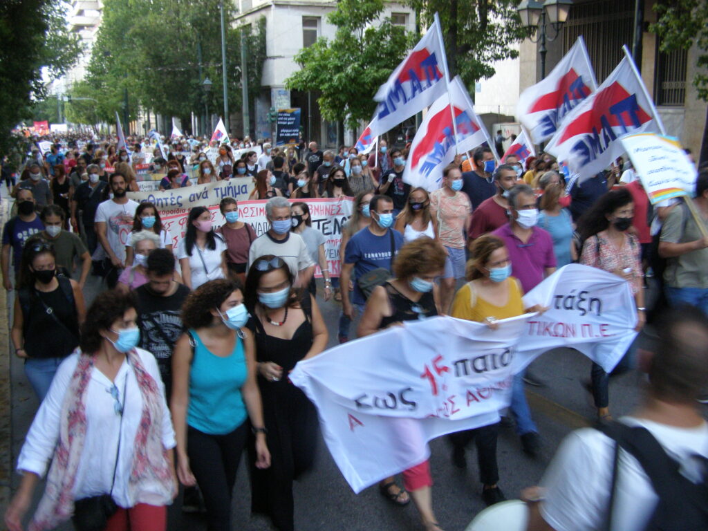Οι εκπαιδευτικοί και οι φοιτητές, βγήκαν στον δρόμο και έκαναν πορεία από τα Προπύλαια στη Βουλή, φωνάζοντας συνθήματα ενάντια στην καταστολή, την έλλειψη μέτρων προστασίας, τα πολυπληθή τμήματα με 25 μαθητές και τεράστια κενά. Είναι ενδεικτικό της κατάστασης, ότι η Κυβέρνηση, όχι μόνο αύξησε τον αριθμό των μαθητών ανά τάξη, ενάντια σε κάθε μέτρο προστασίας από την πανδημία, αλλά αφήνει τα σχολεία με χιλιάδες κενά εκπαιδευτικών σε όλη τη χώρα, με αποτέλεσμα να μην μπορούν να αρχίσουν τα μαθήματα και να μην τηρούνται οι στοιχειώδεις όροι προστασίας από την πανδημία.