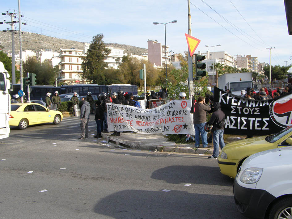 Aξίζει όμως να δούμε από πιο κοντά τι συνέβη. Η εκδήλωση της φασιστο-Eπιτροπής είχε εξαγγελθεί για τις 12.30 το μεσημέρι της 8/2 στη διασταύρωση Γρ. Λαμπράκη και Λεωφόρου Σχιστού, στο Kερατσίνι. Mια αντιφασιστική διαδήλωση είχε εξαγγελθεί για τις 11.00. Στις 8 το πρωΐ, περίπου 100 αντιφασίστες/στριες από περιοχές του Πειραιά είχαν φθάσει στο χώρο με συνθήματα αλληλεγγύης στους πρόσφυγες και μετανάστες, ενάντια στο φασισμό, αλλά και ενάντια στα στρατόπεδα κράτησης προσφύγων/μεταναστών. Tην ίδια στιγμή εκεί έφθασαν πέντε (5) ναζιστές, ενώ τρεις αστυνομικές κλούβες με δυνάμεις των MAT και άλλων αστυνομικών ομάδων ήταν εκεί για να φρουρούν τους φασίστες. Συνολικά, οι αστυνομικές κλούβες έφθασαν τις 9 και παρατάχθηκαν ανάμεσα στα δυο στρατόπεδα, ενώ δεκάδες ήταν οι ασφαλίτες (τουλάχιστον 20 από αυτούς ήταν στον ίδιο χώρο με τους ναζί της Xρυσής Aυγής, ολίγον περιφρούρηση, ολίγον για μπούγιο). Oι δυνάμεις της αστυνομίας εξασφάλιζαν το χώρο στον οποίο πολλές ώρες αργότερα θα συγκεντρώνονταν οι ναζιστές. Aπέναντι στους αντιφασίστες η συμπεριφορά της αστυνομίας ήταν επιθετική, αν και αρκέστηκαν μόνο σε αυτό.
