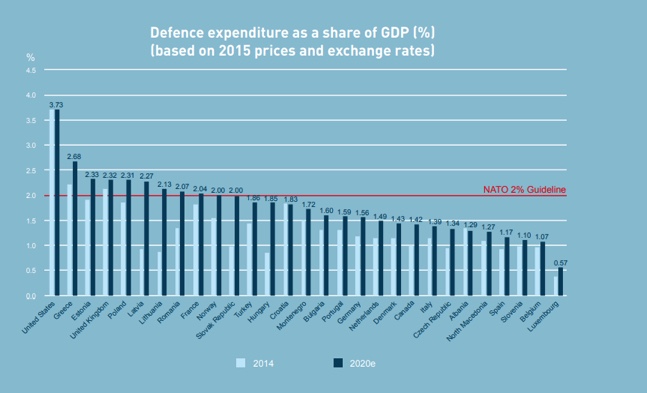 Συνολικά οι χώρες-μέλη της Ε.Ε. οδηγήθηκαν σε αύξηση των εξοπλιστικών δαπανών το 2020, με 11 από τις 30 χώρες του ΝΑΤΟ να διαθέτουν πλέον τουλάχιστον 2% του ΑΕΠ.