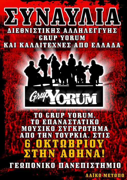 Το Grup Yorum έρχεται στην Αθήνα στις 6 Οκτωβρίου 2023 σε μια μουσική εκδήλωση αλληλεγγύης των λαών σε Ελλάδα και Τουρκία, για να δώσει φωνή στην οργή ενάντια στους κοινούς εχθρούς και να τραγουδήσει μαζί τα τραγούδια της επανάστασης.