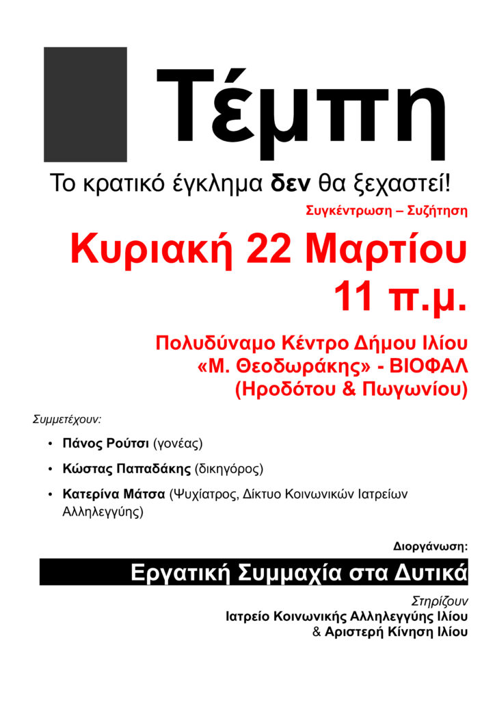 Συγκέντρωση – Συζήτηση την Κυριακή 22 Μαρτίου, παραμονή της έναρξης της δίκης για την δολοφονία των 57 στα Τέμπη.