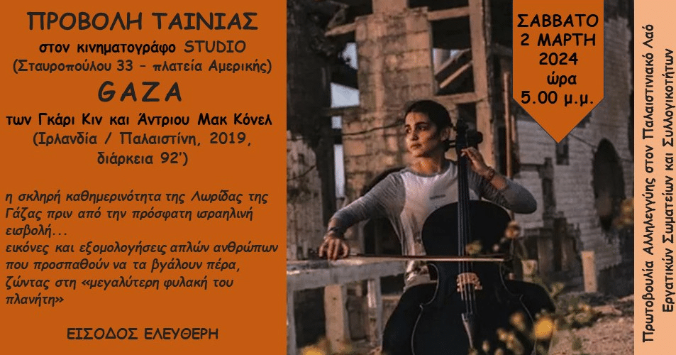 Το Σάββατο 2 Μαρτίου, στις 5:00 μ.μ., η Πρωτοβουλία Αλληλεγγύης στο Παλαιστινιακό Λαό Εργατικών Σωματείων και Συλλογικοτήτων διοργανώνει κινηματογραφική προβολή στον κινηματογράφο STUDIO (Πλατεία Αμερικής), της πολύ ενδιαφέρουσας ταινίας GAZA των Γκάρι Κιν και Άντριου Μακ Κόνελ (Ιρλανδία/Παλαιστίνη, 2019, διάρκειας 92’). Η είσοδος είναι ελεύθερη, με την επισήμανση ότι η προβολή θα ξεκινήσει αυστηρά στις 5:00
