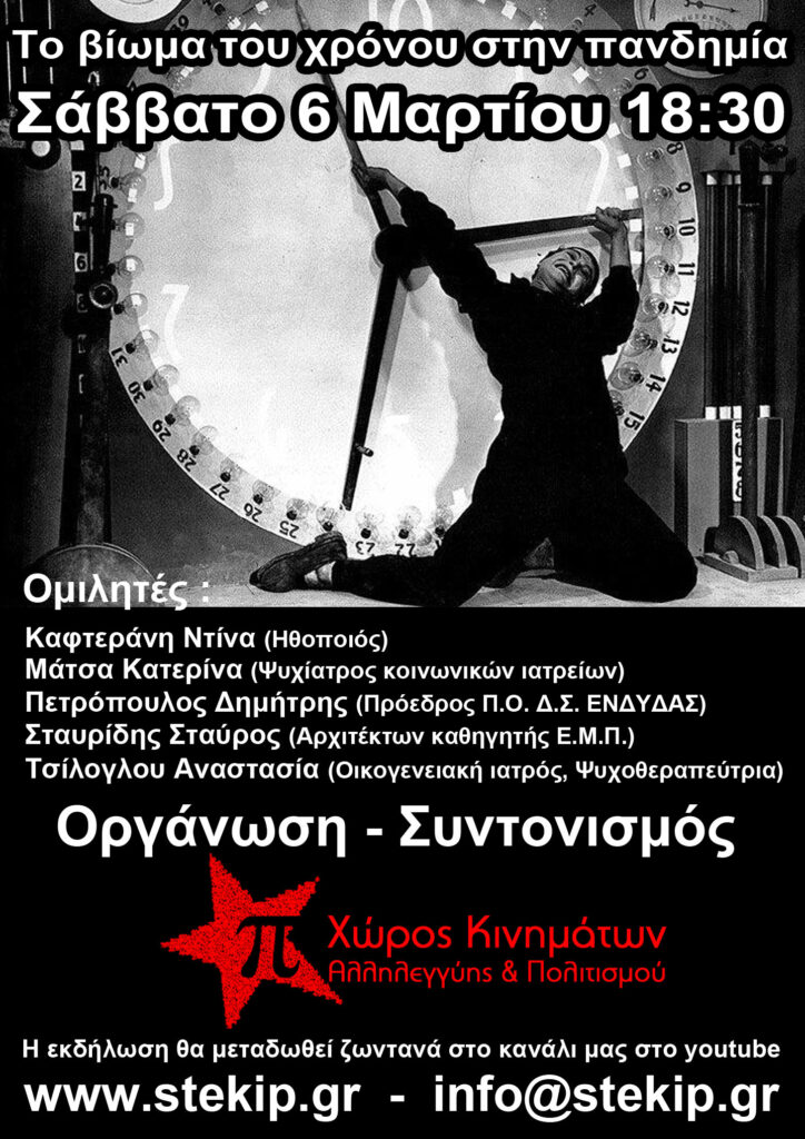 Την ενδιαφέρουσα συζήτηση για το βίωμα του χρόνου οργανώνει το στέκι π– χώρος αλληλεγγύης- κινημάτων και πολιτισμού. Στην πρόσκλησή του μας καλεί σε μια συζήτηση – εκδήλωση «ενταγμένη σε μια συνολική προσπάθεια να αναδείξουμε το ευρύ ζήτημα της διαχείρισης του χρόνου εν μέσω καραντίνας». Όπως γράφει σε ένα μικρό σημείωμα: